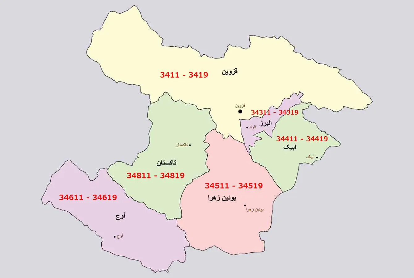 کد پستی شهرهای استان قزوین را از روی نقشۀ زیر مشاهده کنید: